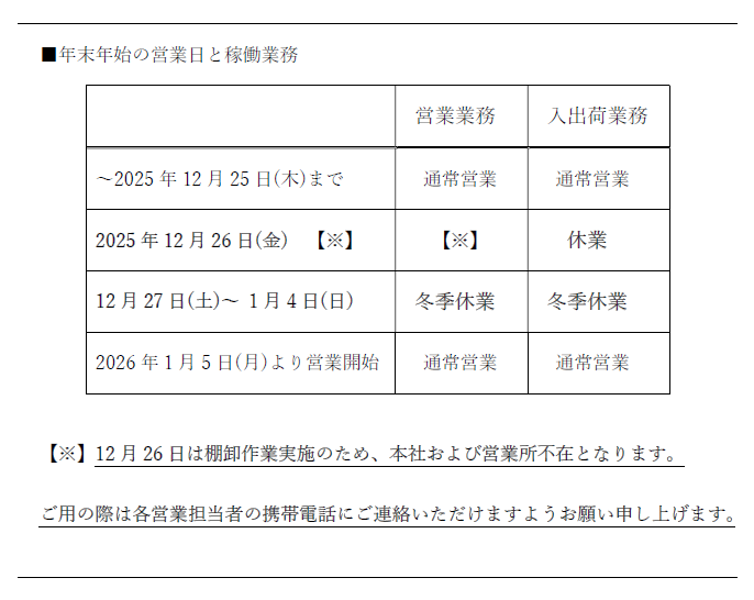 棚卸作業のため、2025年12月26日は各拠点の問合せ対応に変更がございます。詳細は